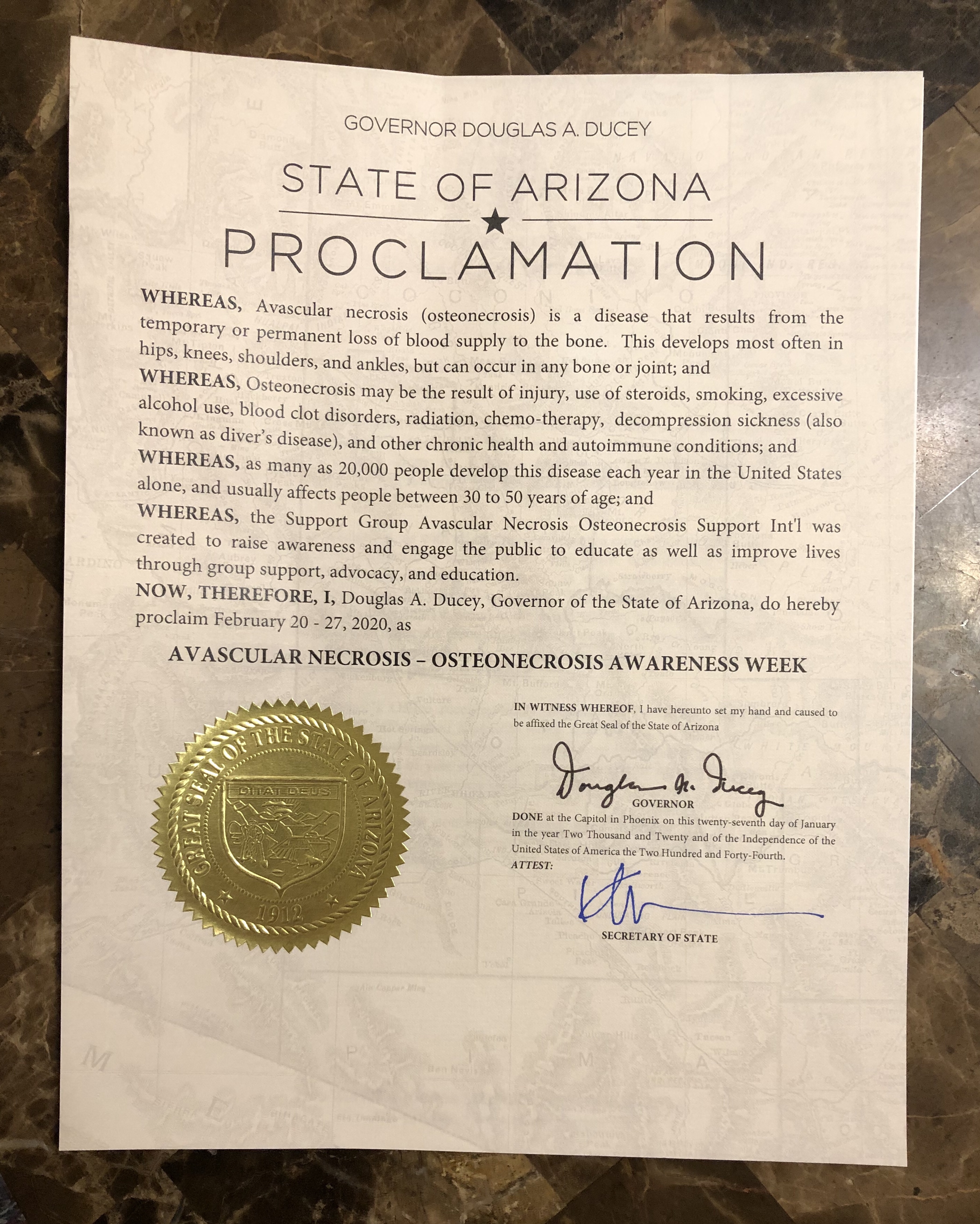 So as you know I have been working very hard on November 29 being National – Avascular Necrosis Osteonecrosis awareness day and all states have come on board so far but still waiting to hear from maybe 10 states.