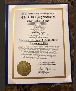 I have been advocating for over 5 years on Avascular Necrosis -Osteonecrosis and I am proud and grateful that our elected officials are also recognizing this awareness day.