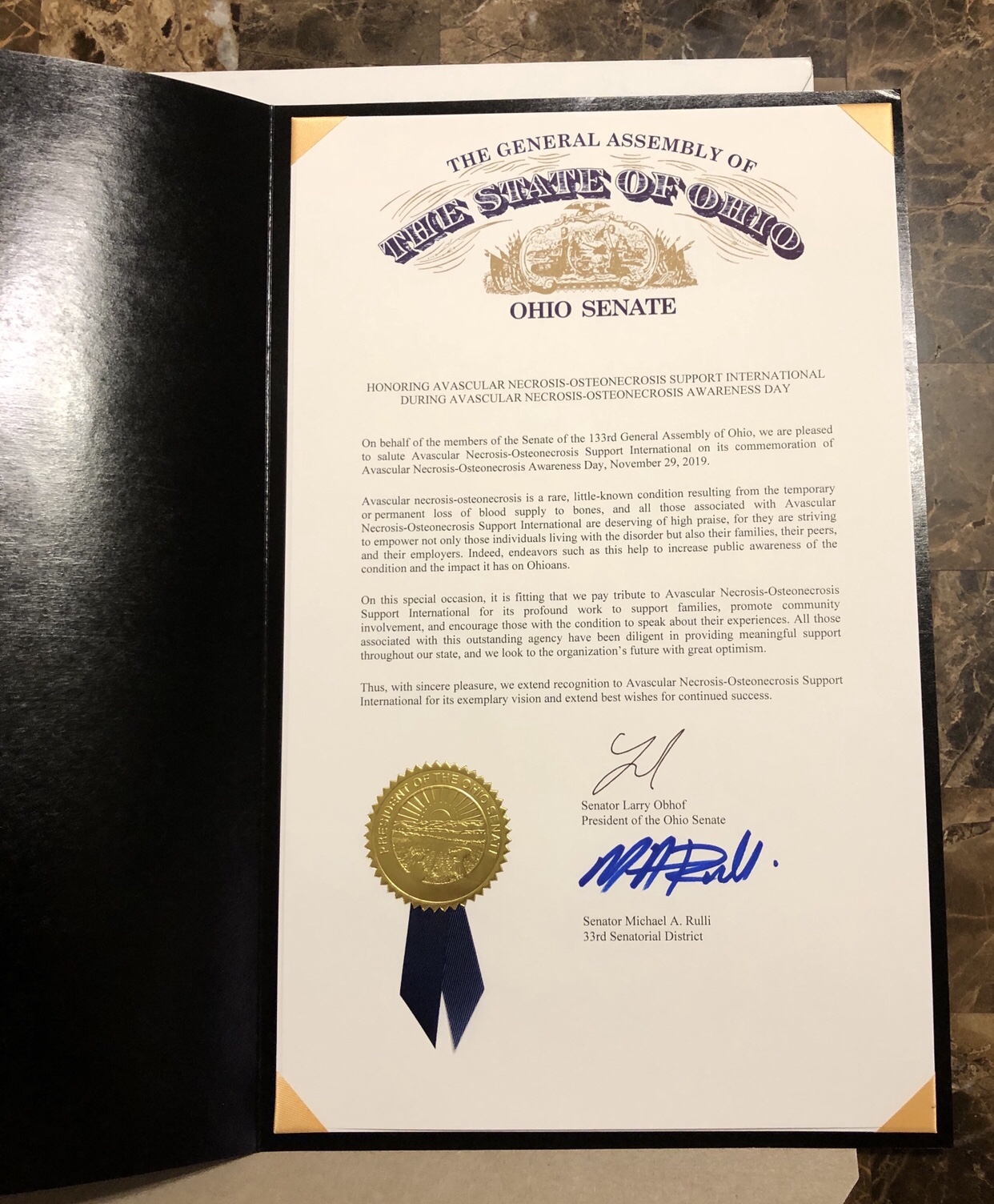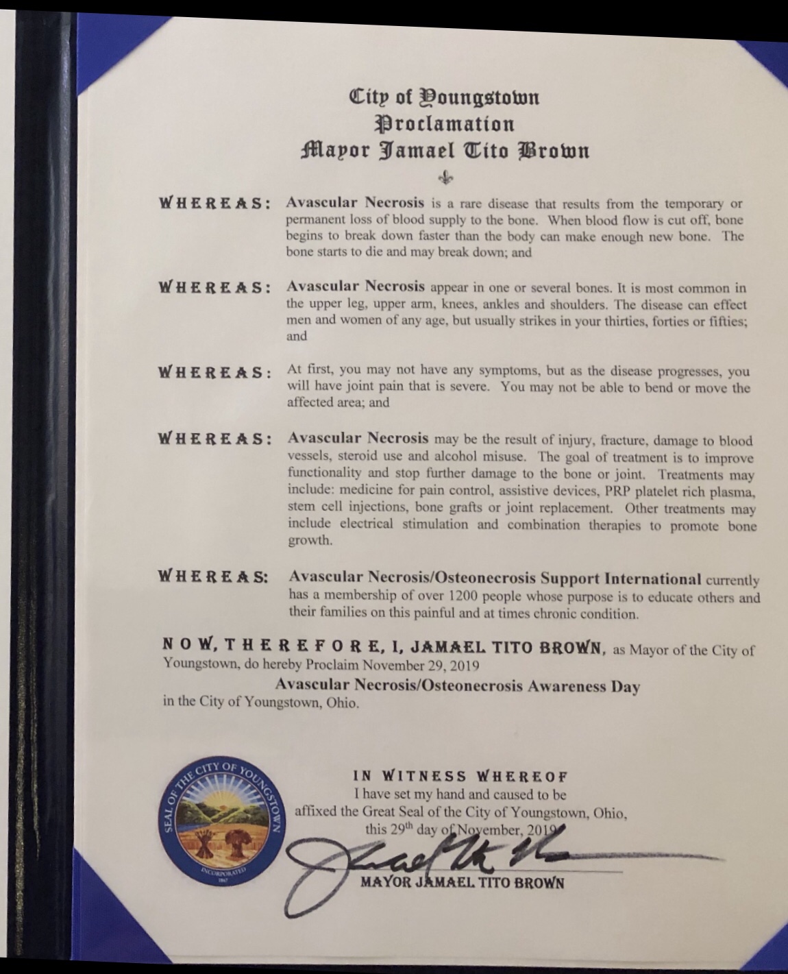Official Proclamation Avascular Necrosis-Osteonecrosis Awareness Day November 29